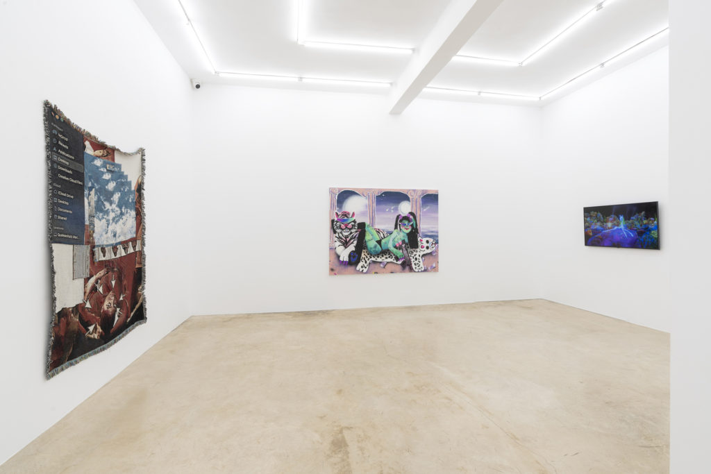 Qualeasha Wood works with textile and digital images which at first may seem to be a clash of worlds, but which come together to speak of her experience as a queer black woman in contemporary US society. Textile has long been associated with women’s tasks but also as a metaphor for the digital world in which individual threads are seen as a precursor to the pixel. Sprinkled with selfies, text messages, and Catholic iconography, the pieces speak to the power and complexity of self-representation in a digital age mired with racial and sexual inequalities deeply entrenched within society. Wood’s critique of the contemporary refuses to acquiesce and step into the subdued acceptance of violence towards black women that has pervaded for centuries and is yet to cease. By taking her own image and stitching it in complex tapestries, she juxtaposes the rapidity of the internet with the labour of producing this fabric – in doing this the decision to make a specific image is turned into the power of re-appropriating her own image and fully controlling its dissemination as a fetishistic holy icon of self-reverence and desire. The internet is a place that offers liberation for marginalised communities but simultaneously increases the circulation of images and objectification of bodies. This leaves these same communities vulnerable to new forms of digital exploitation.