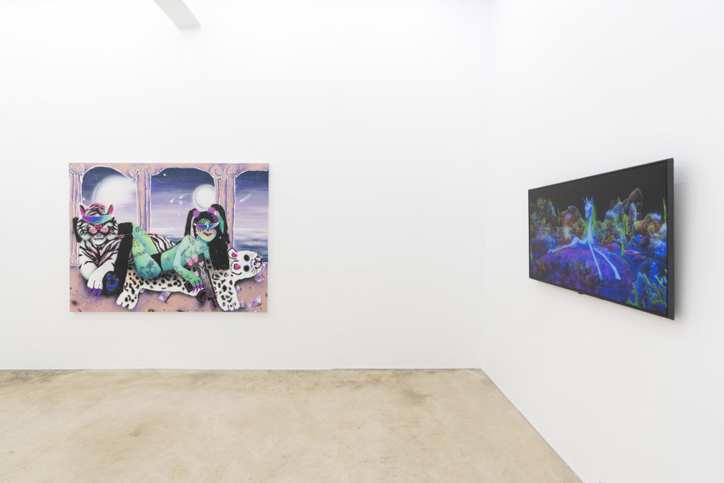Claudia Maté has become an internationally recognized symbol of digital art through her CGI animations that have become not only works of art, but have appeared in numerous and varied collaborations with television programs such as Adult Swim and high fashion brands including Balenciaga and Alexander Wang. Like rock n’ roll, the worlds of programming and even fashion are heavily dominated by male engineers and fashion house founders, and Maté’s surreal and at times grotesque visual style dives into the subconscious imagination of the internet with surreal and pixelated aesthetics. In Kittens Inspired by Kittens, the figures of Doraemon and XXX ride a celebratory parade of bacchanalia, turning childhood experience into adult escapism. In Down the Shining Hole, a unicorn sits among an underwater scene, mixing fantasy worlds with video-game aesthetics in the context of an abyssal realm. Cuteness and innocence are remixed into dark and disturbing scenes.