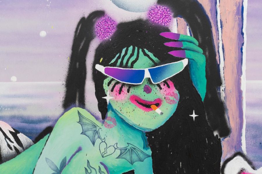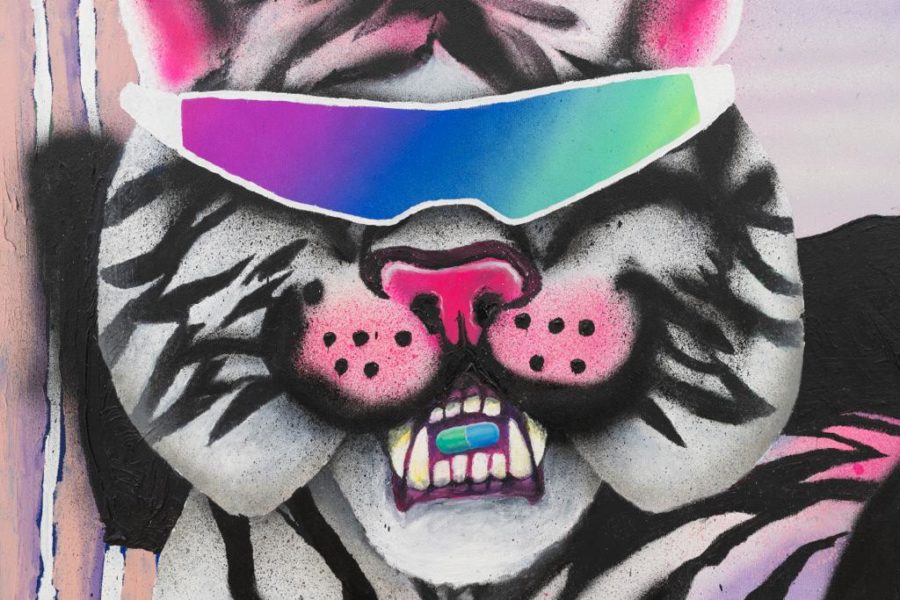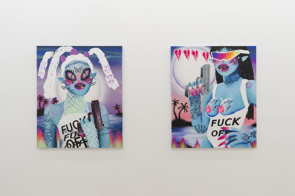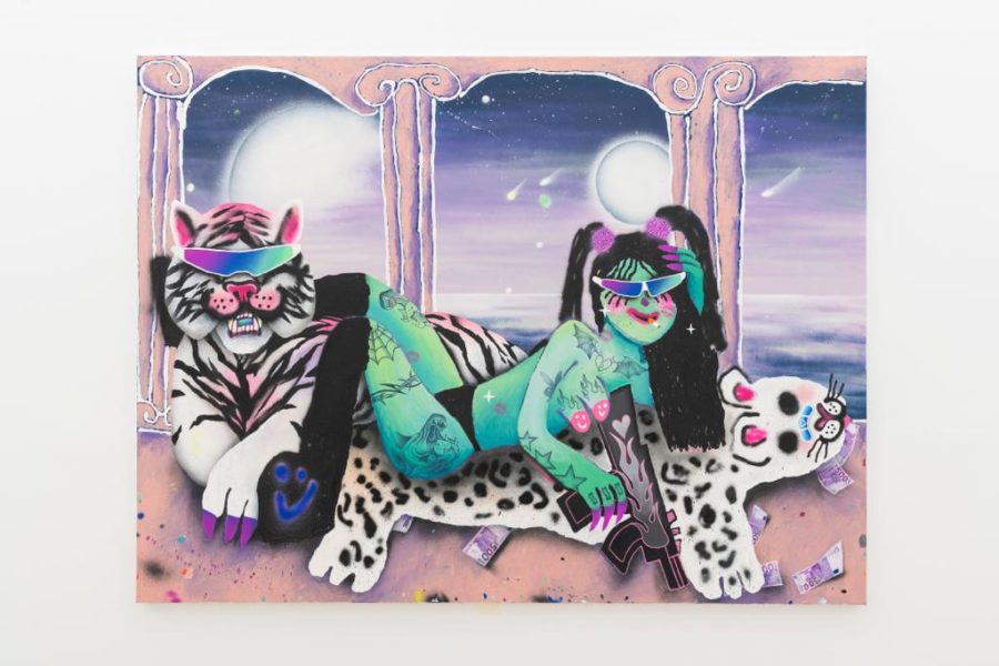 Bel Fullana’s paintings are bright and playful expressionistic canvases that portray liberated women in comic-like techno-environments. In Techno Tiger (2023) Fullana readily displays her technique as rough sprayed outlines spill out from a tiger’s patterns onto the white canvas. Her subjects often depict seemingly dangerous and sexually liberated women surrounded by recent social media trends. In this case, the figure lies in a twisted position which faces the ground while spread-eagle over a white tiger. She holds a weapon in her hand with an unworried expression as a cosmic sci-fi landscape opens up beyond ionic columns. Five hundred euro notes litter the floor below her, indicating the reversal of patriarchal social stereotypes that must necessarily be dismantled not only in terms of social mores, but firstly, financially. In 2021, a BBC investigation found that paintings by women artists sell for one-tenth of those of men of equal recognition in their careers – Fullana’s characters metaphorically indicate society’s assumptions of the female artist while reclaiming her full due.1