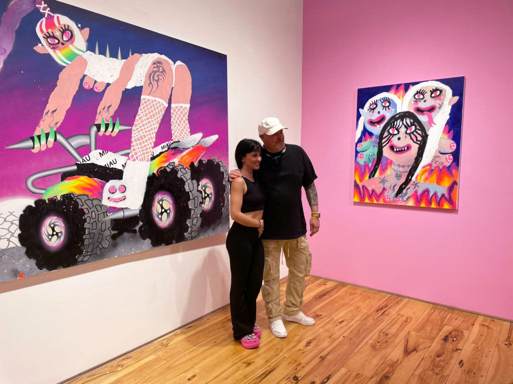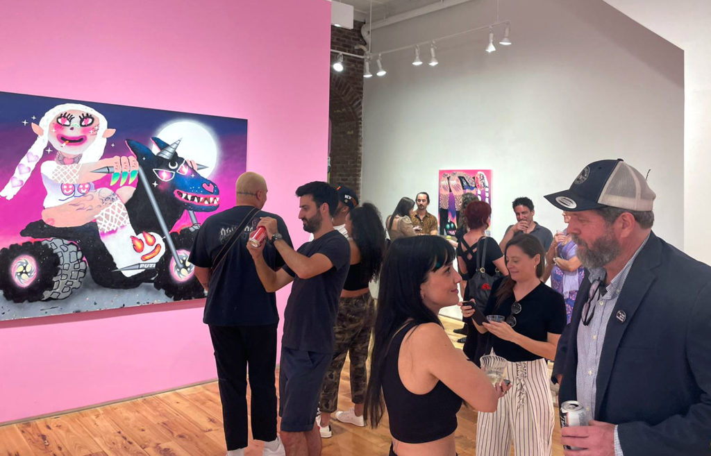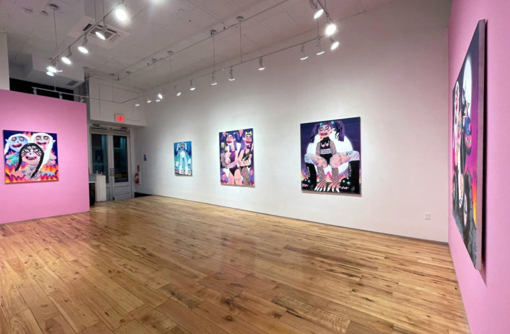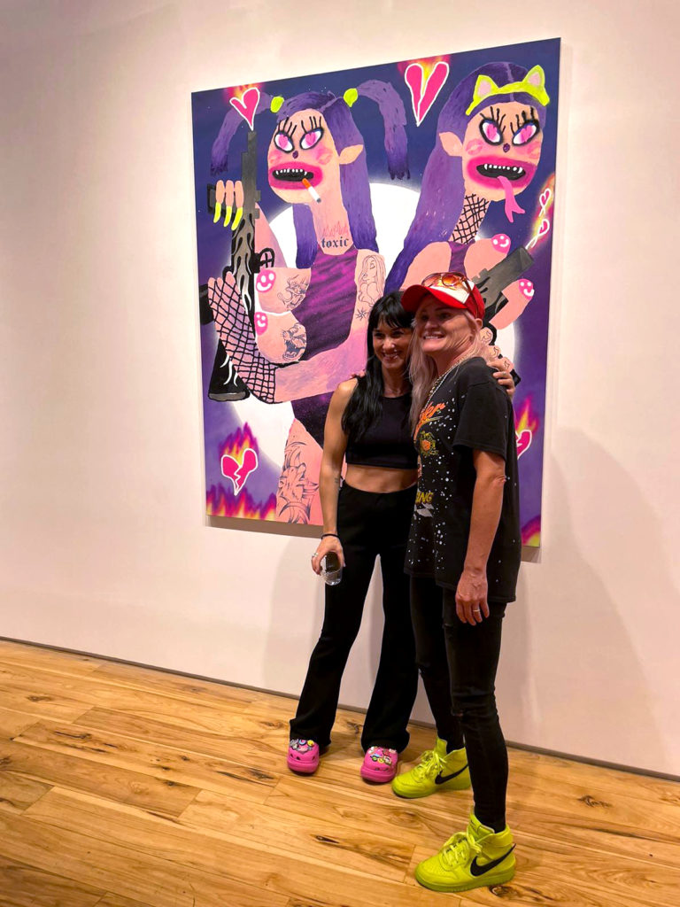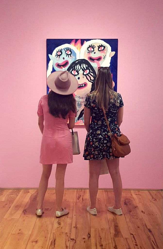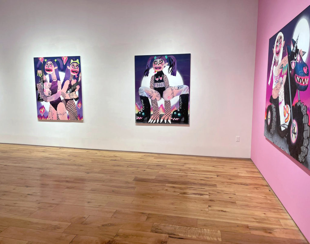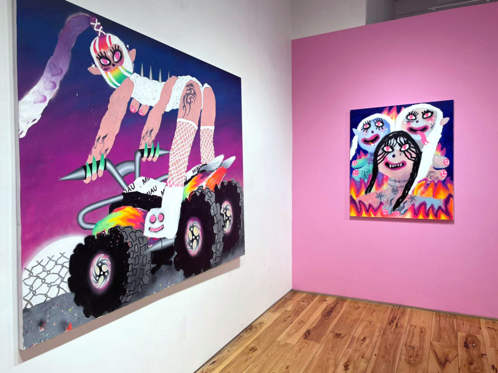 In the context of PutiPandi (which translated into English means Bad Girls Gang) Fullana’s painterly extremes feed into representations of women who are extreme in their own right. Feminine, marvelous, not to be messed with, alluring, and seemingly indestructible. All the markings of girlishness are present, but as floating signifiers rather than paragons. The figure in the painting Baby Killer, for example, radiates all the enchantment of a Lisa Frank sticker; but her boots with hearts for eyes, and her dolphin tattoo, only serve to highlight the fact that she’s actually posing on a battlefield.