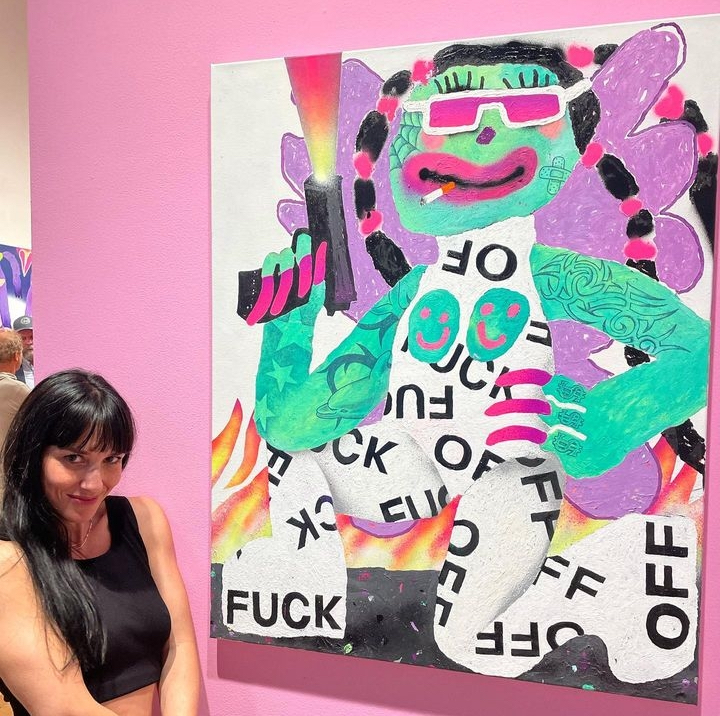 Looking into the glistening, anime-like eyes of Fullana’s “bad girls,” one can’t help but think of global conflicts affecting citizens worldwide. The Instagrammable pose each girl adopts suggests love spilling over into duty. Even as soldiers, however, these girls exist to fight for themselves as much as against the onslaughts of their enemies. The figure featured in Fuck Off Queen has this very message quite literally written all over her body. Yet this urbane vulgarity becomes an eloquent statement of self-affirmation, of indignant autonomy, when set against the patterned flames that constitute the painting’s backdrop.