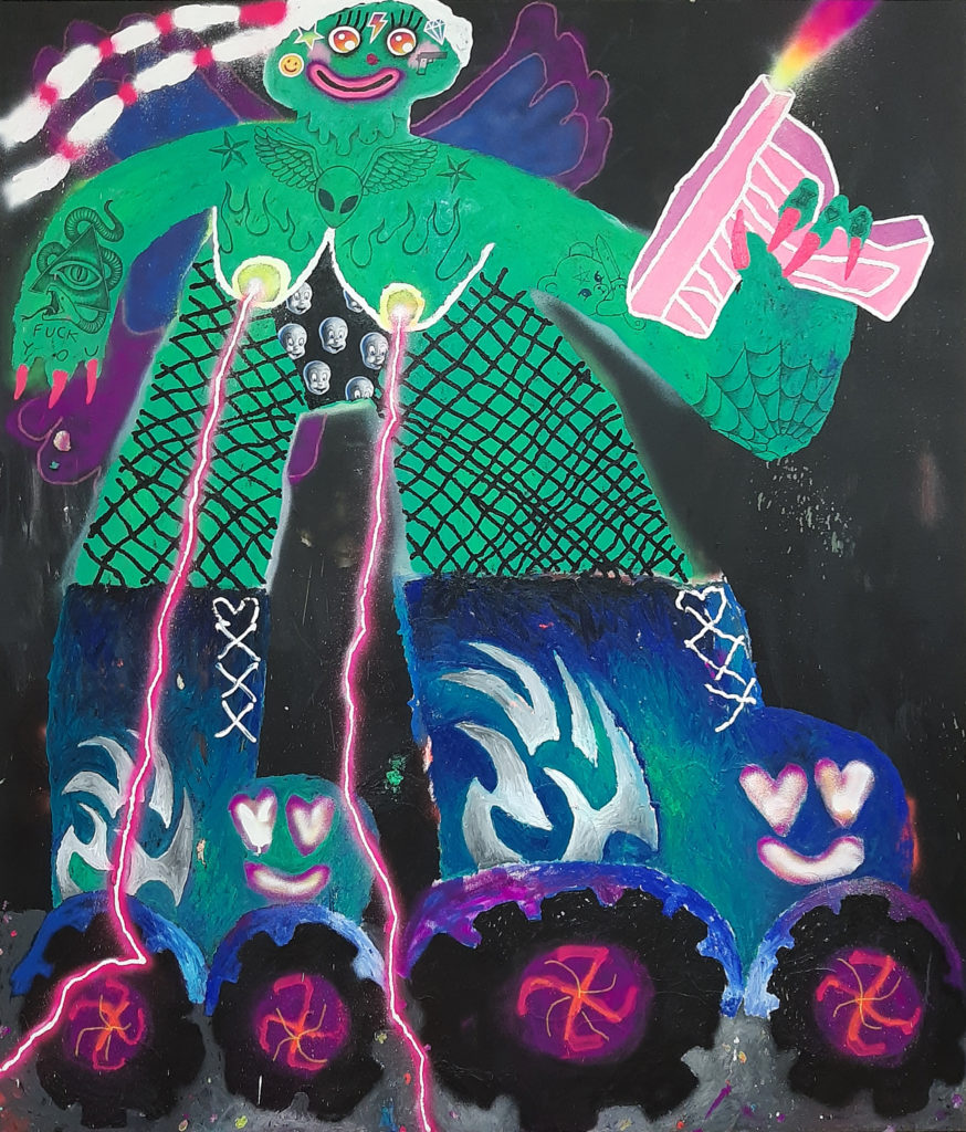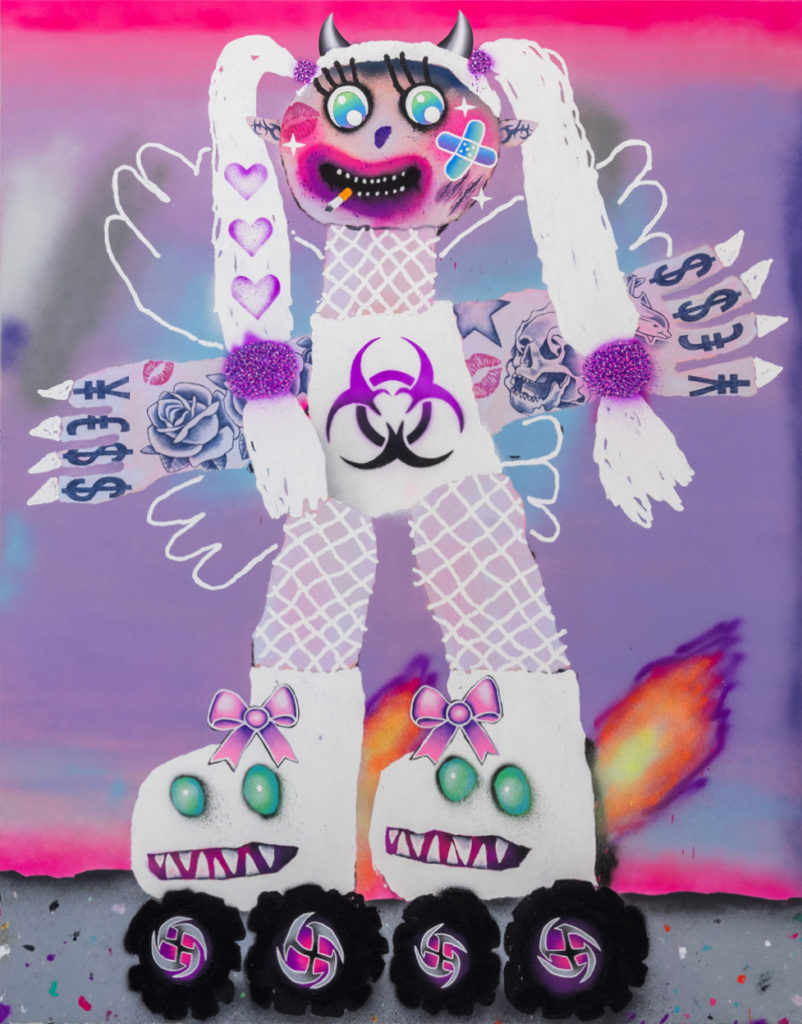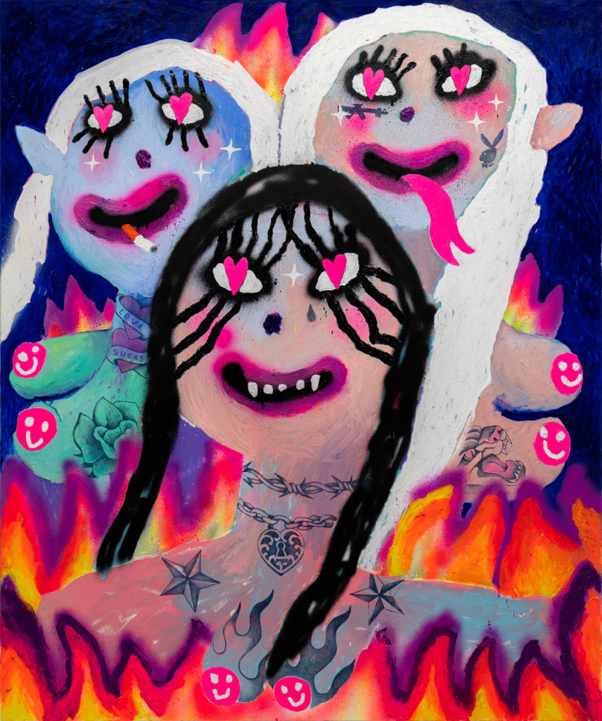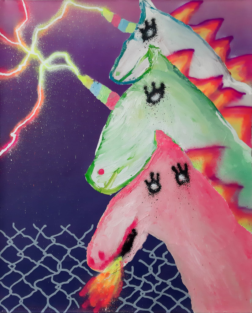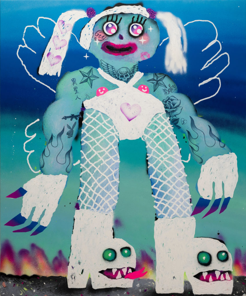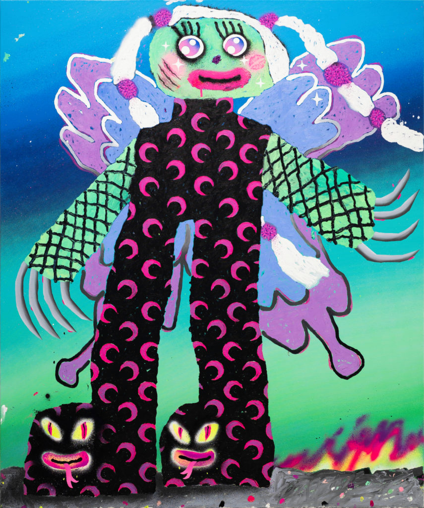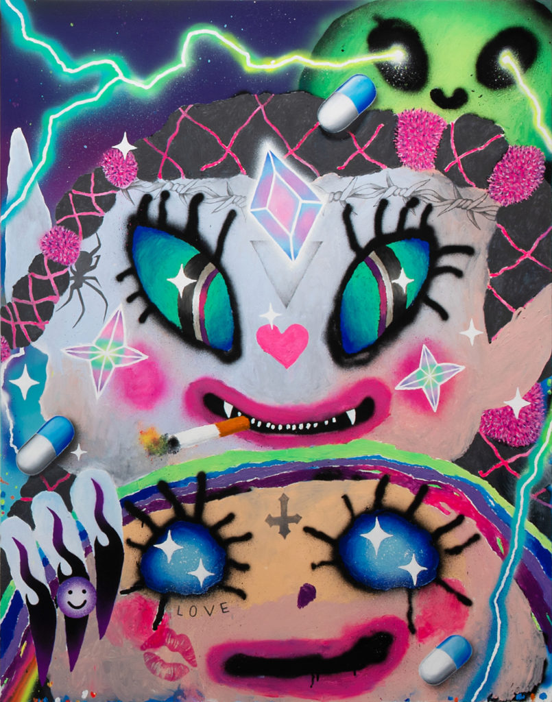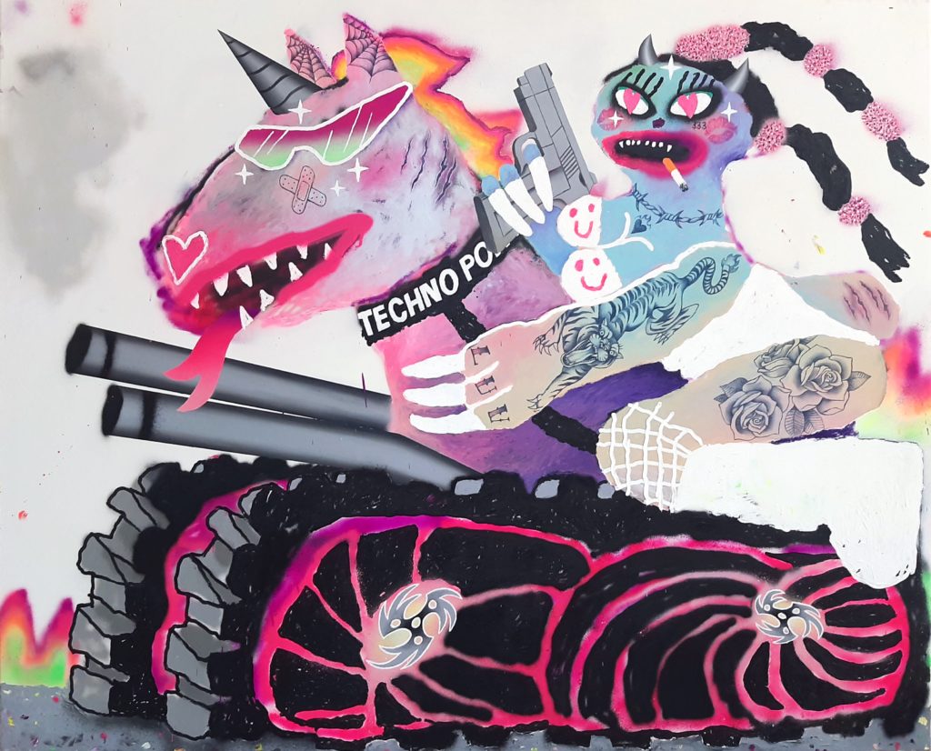Oil, acrylic, charcoal, marker pen and spray on canvas