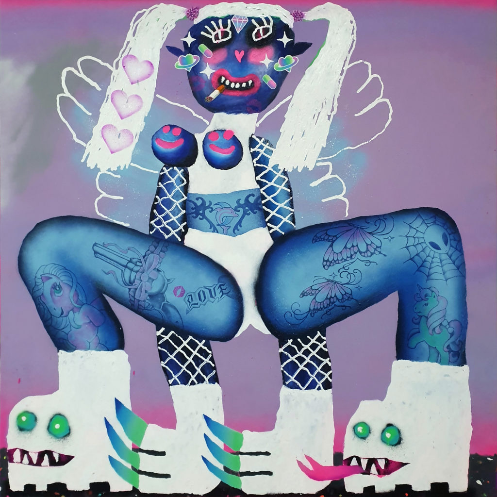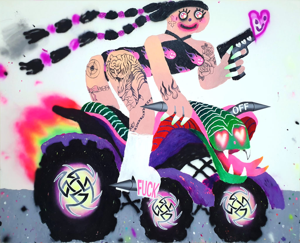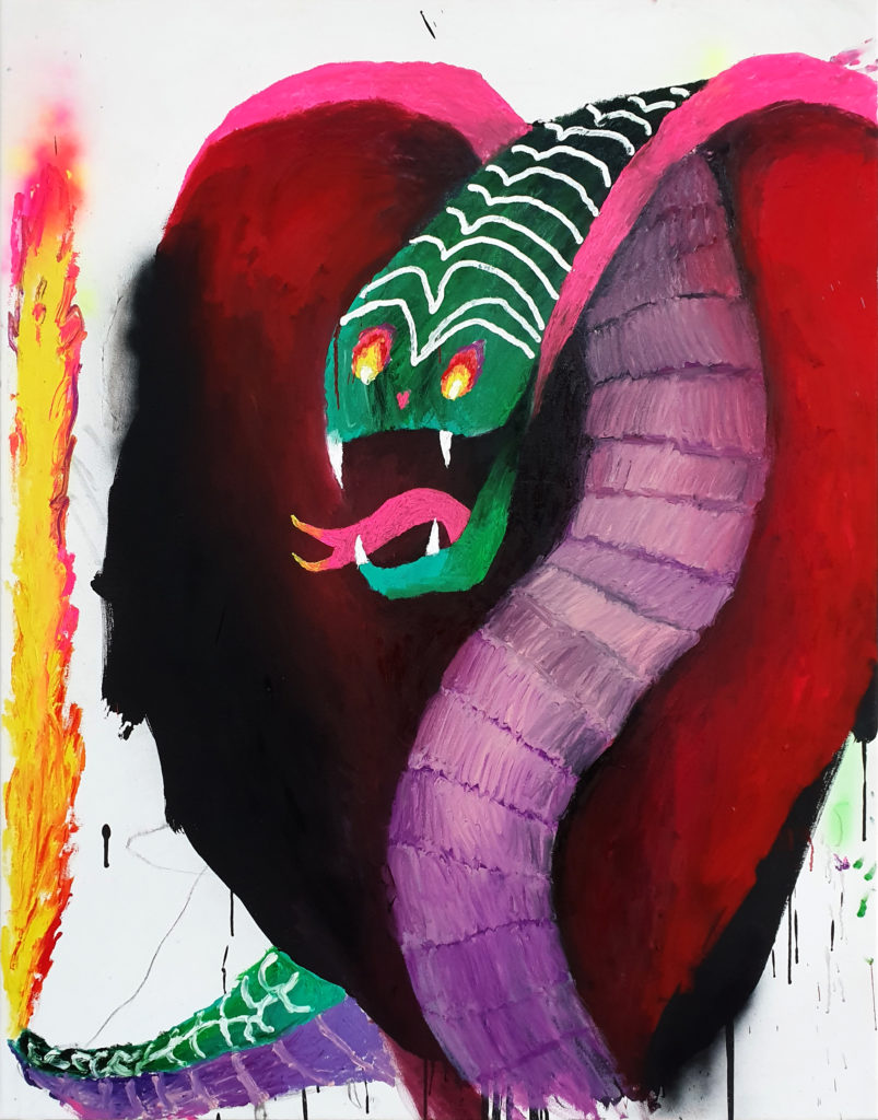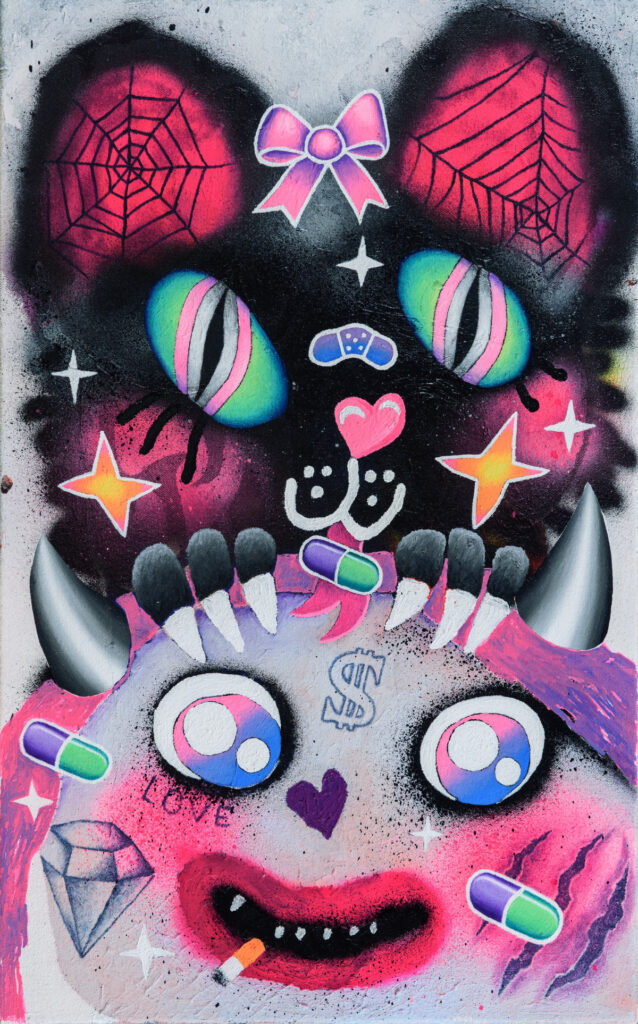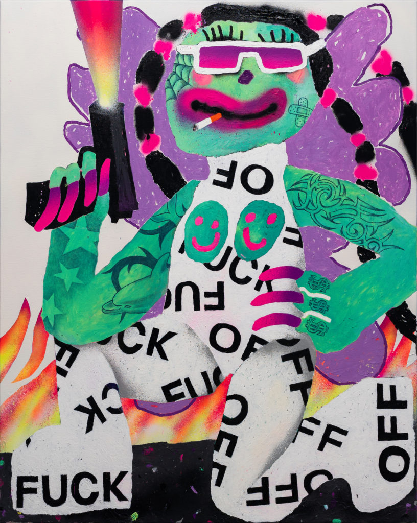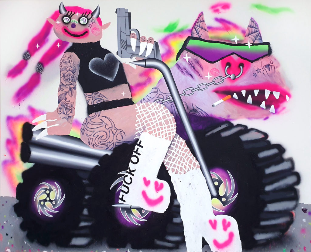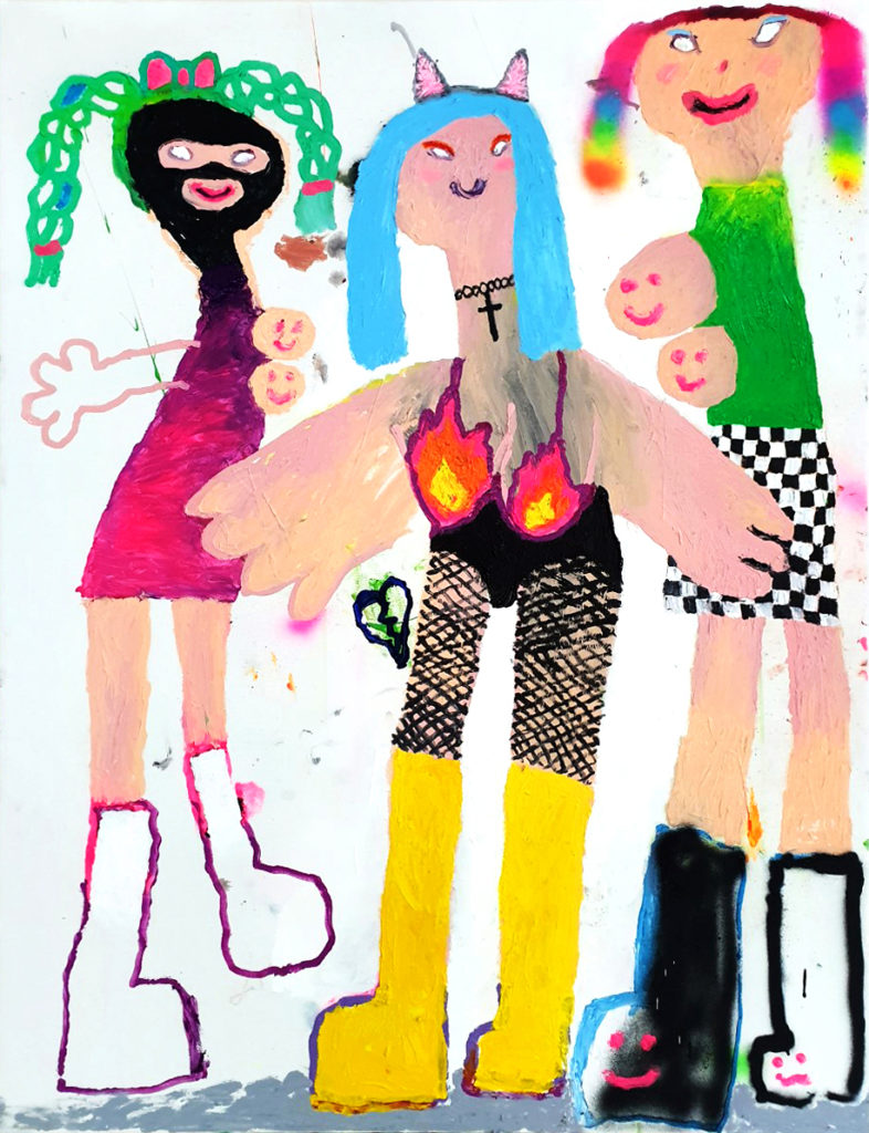 Oil, acrylic, charcoal, marker pen and spray on canvas