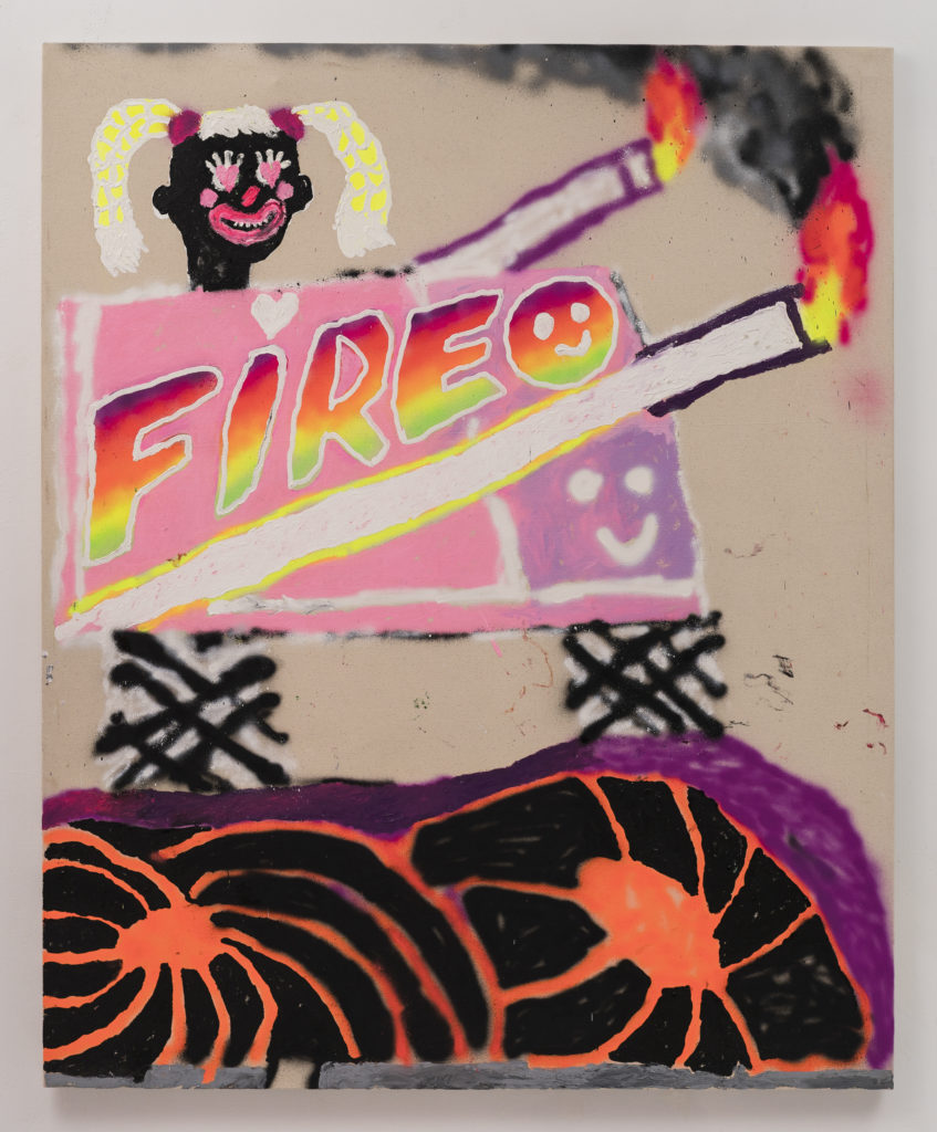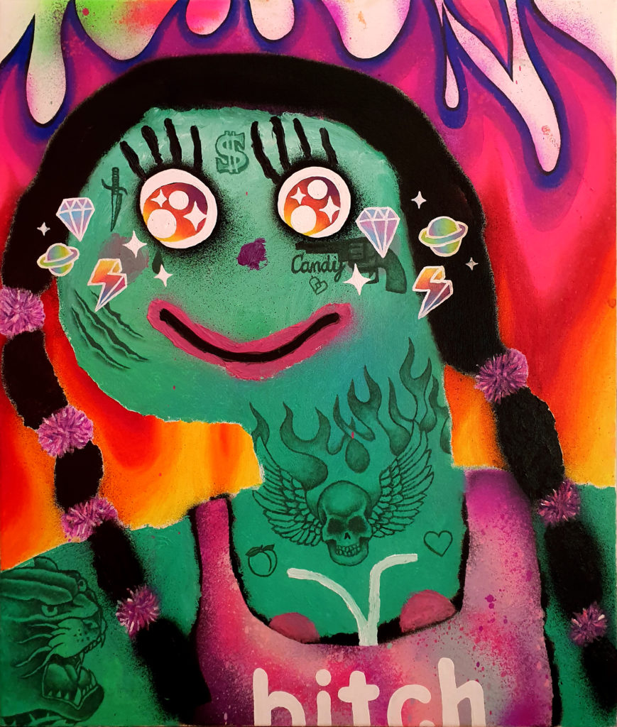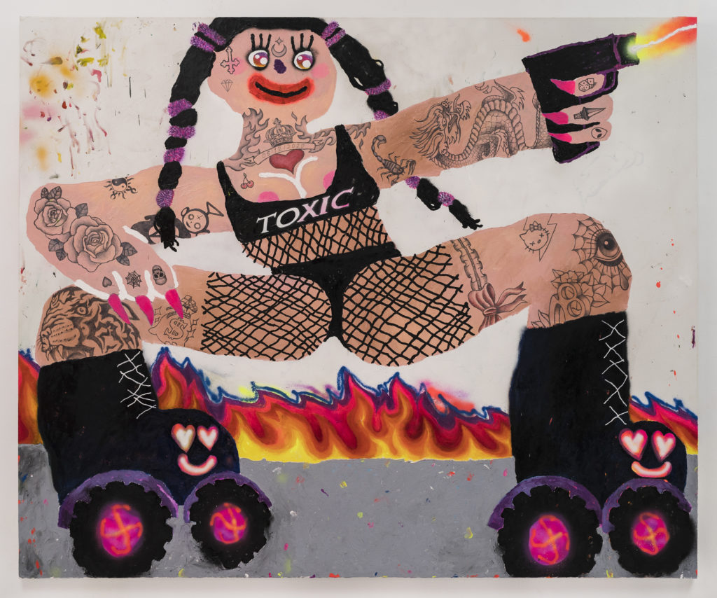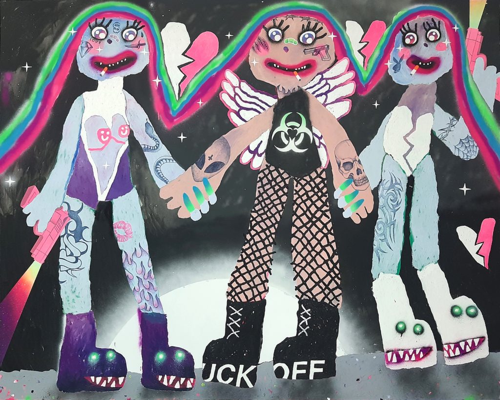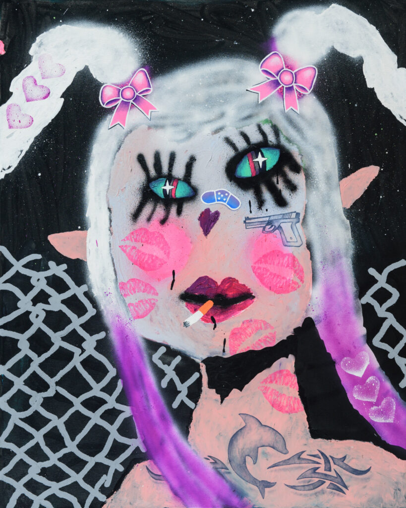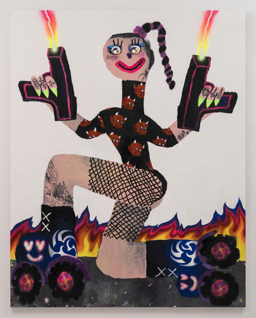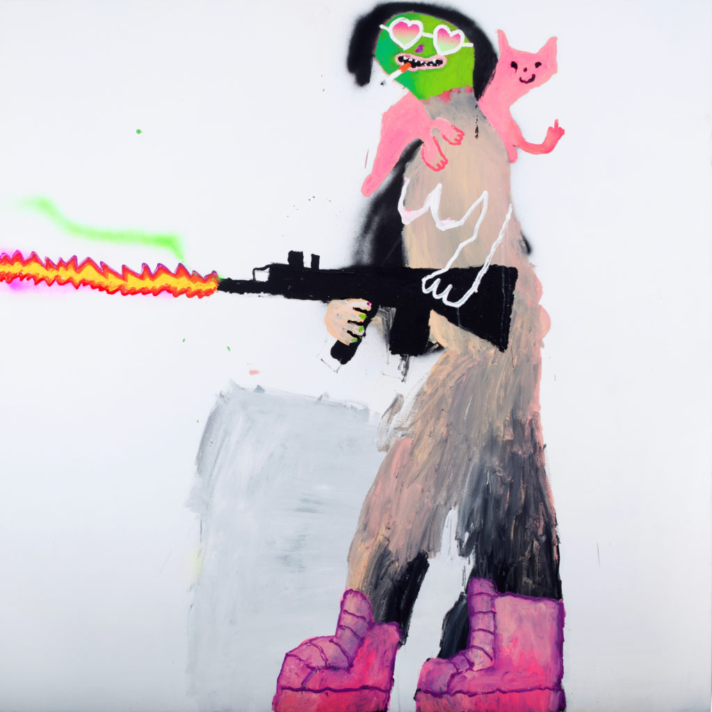 Oil, acrylic, charcoal, marker pen and spray on canvas