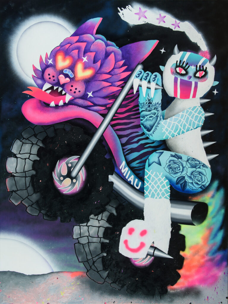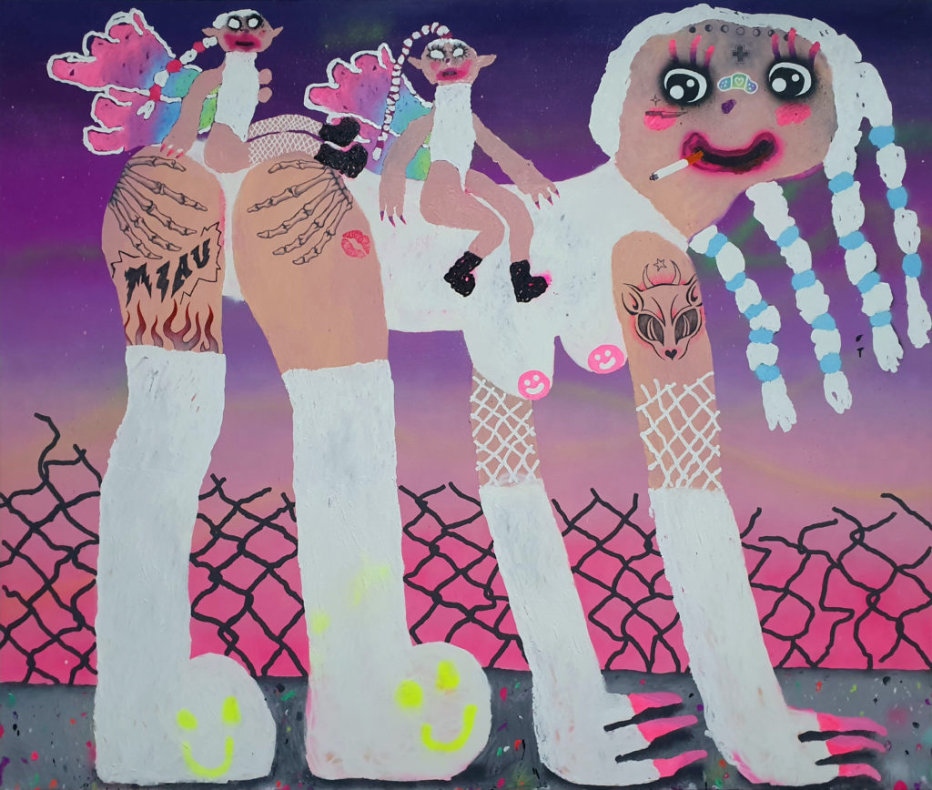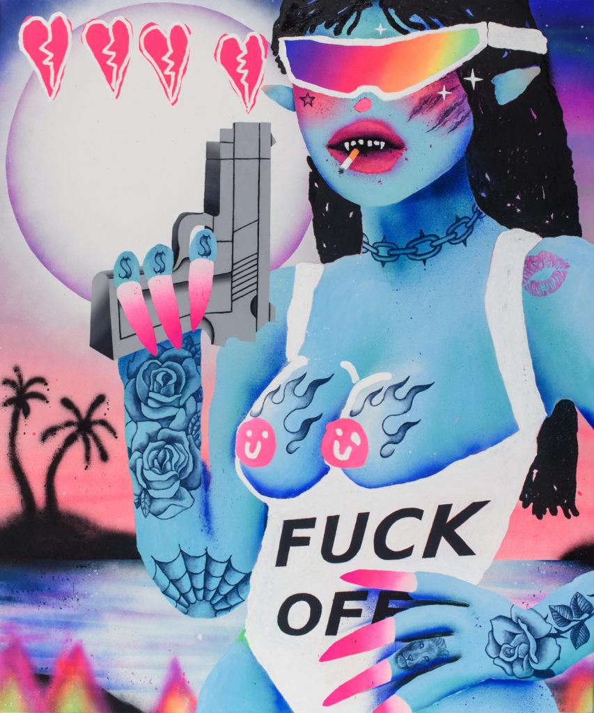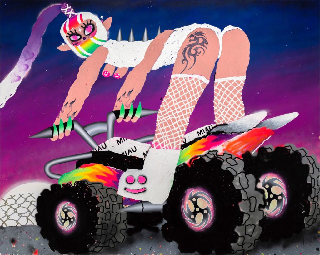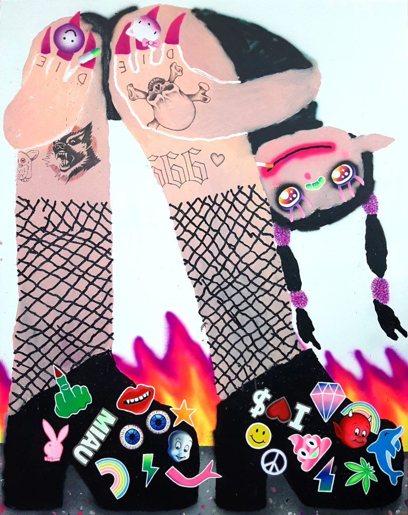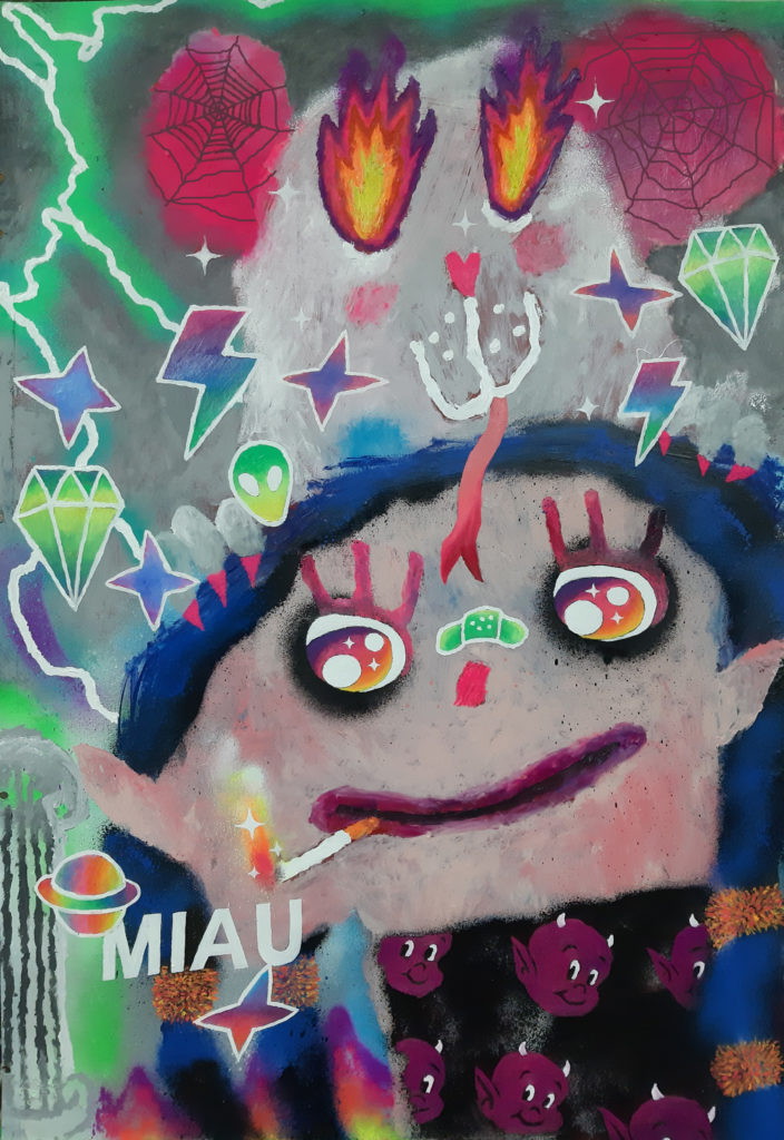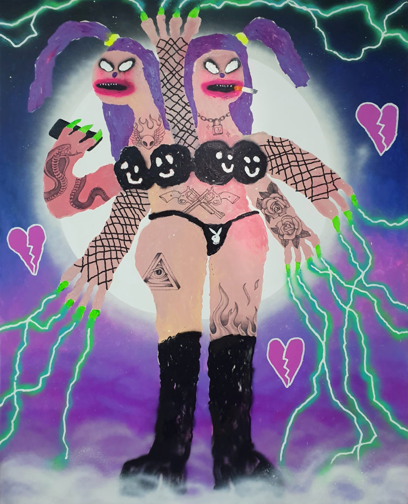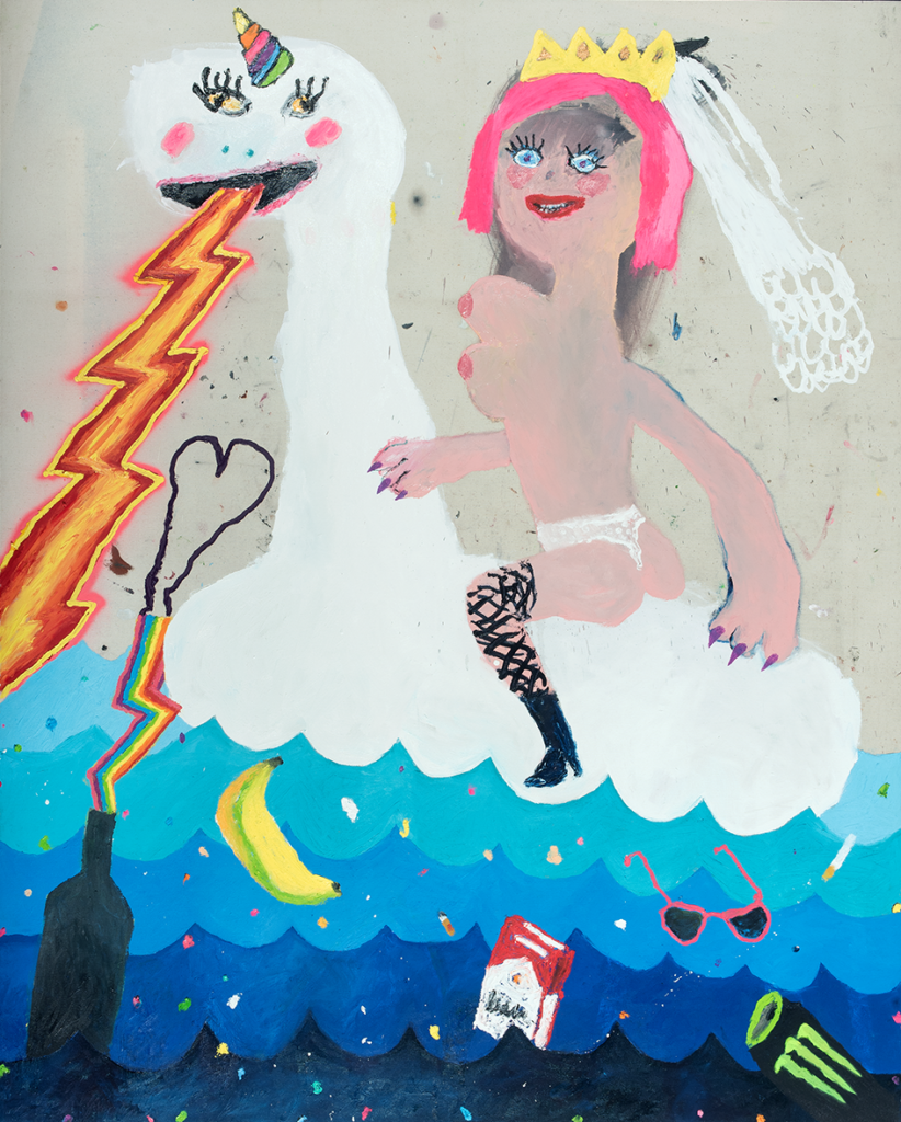 Oil, acrylic, charcoal, marker pen and spray on canvas