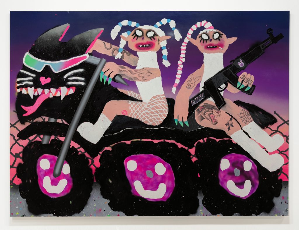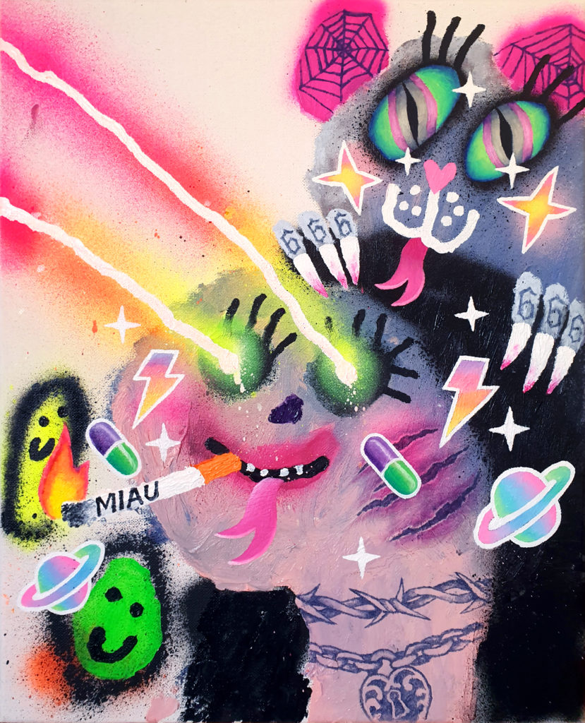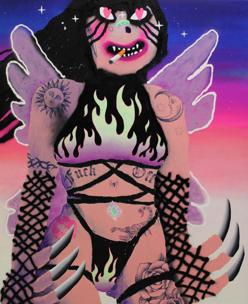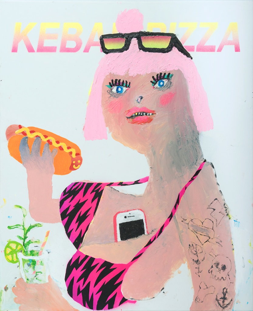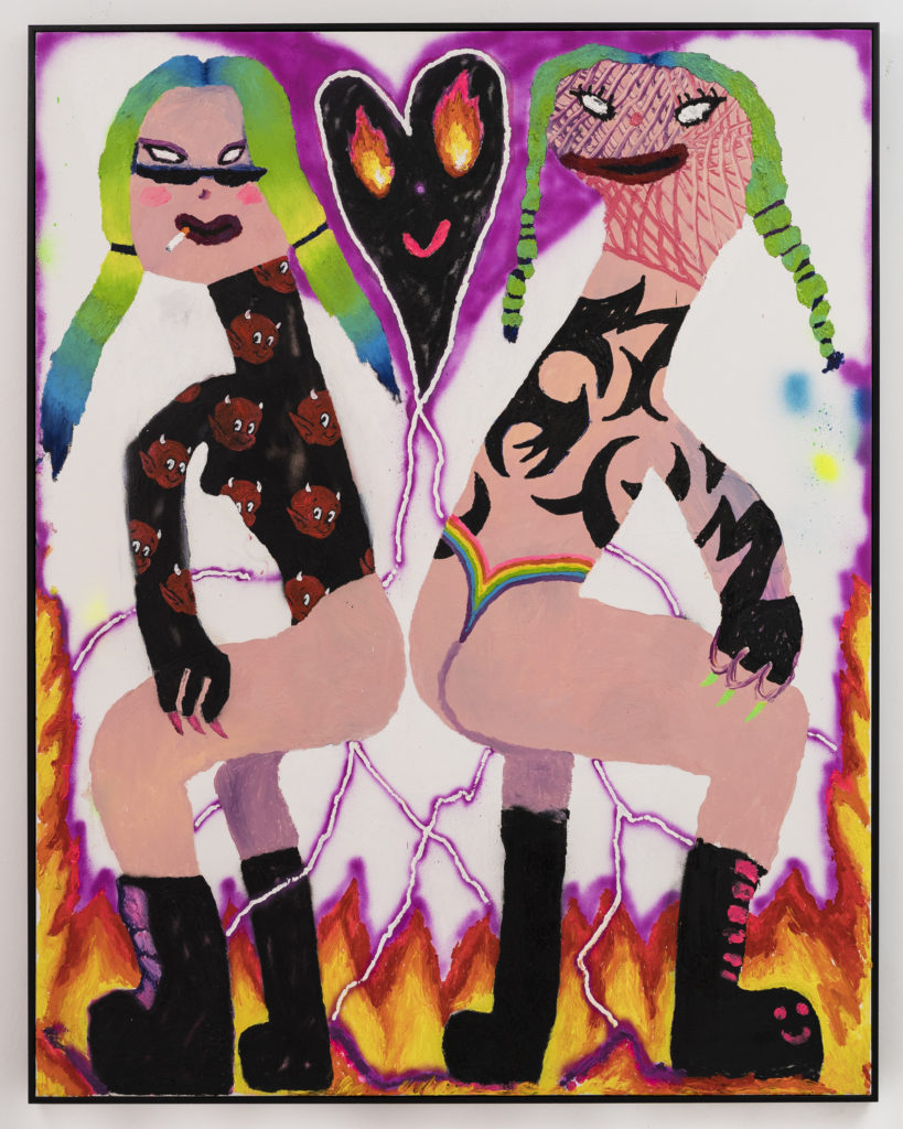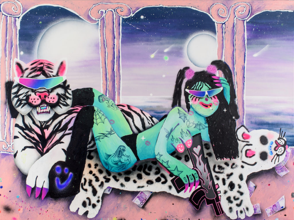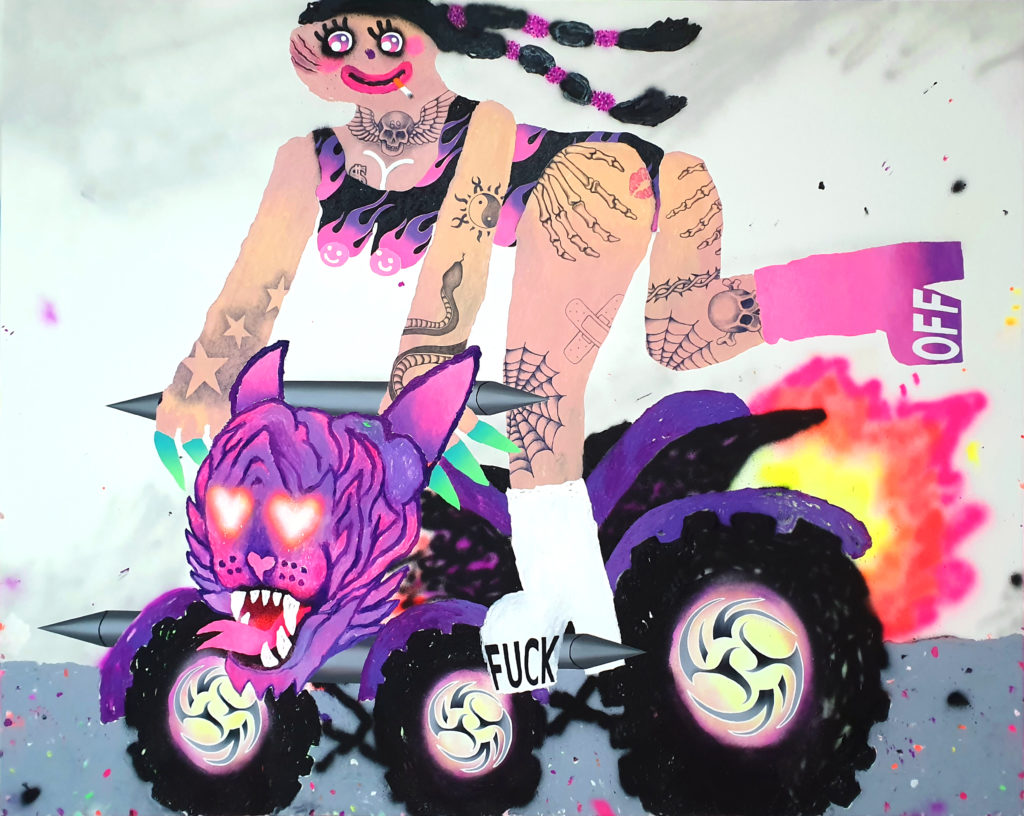 Oil, acrylic, charcoal, marker pen and spray on canvas