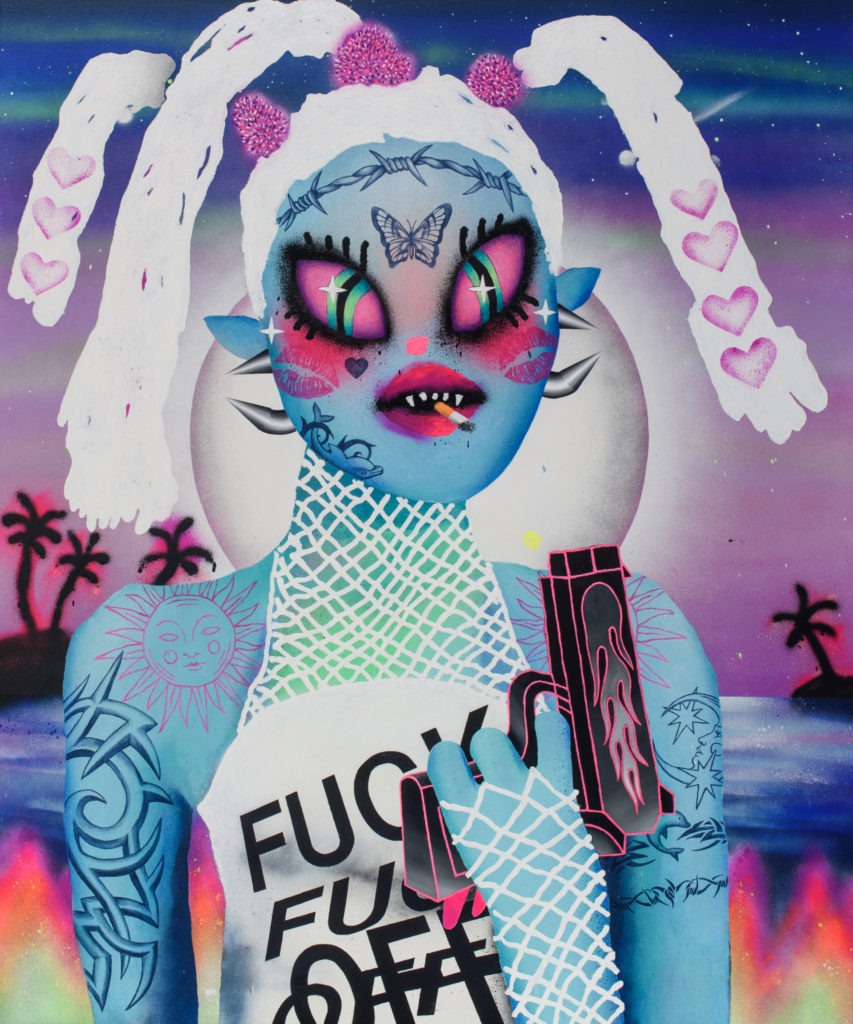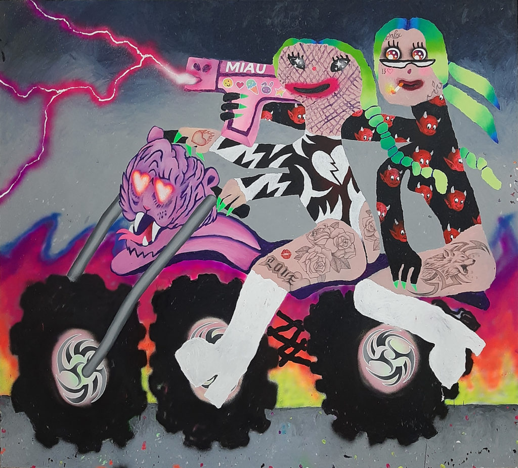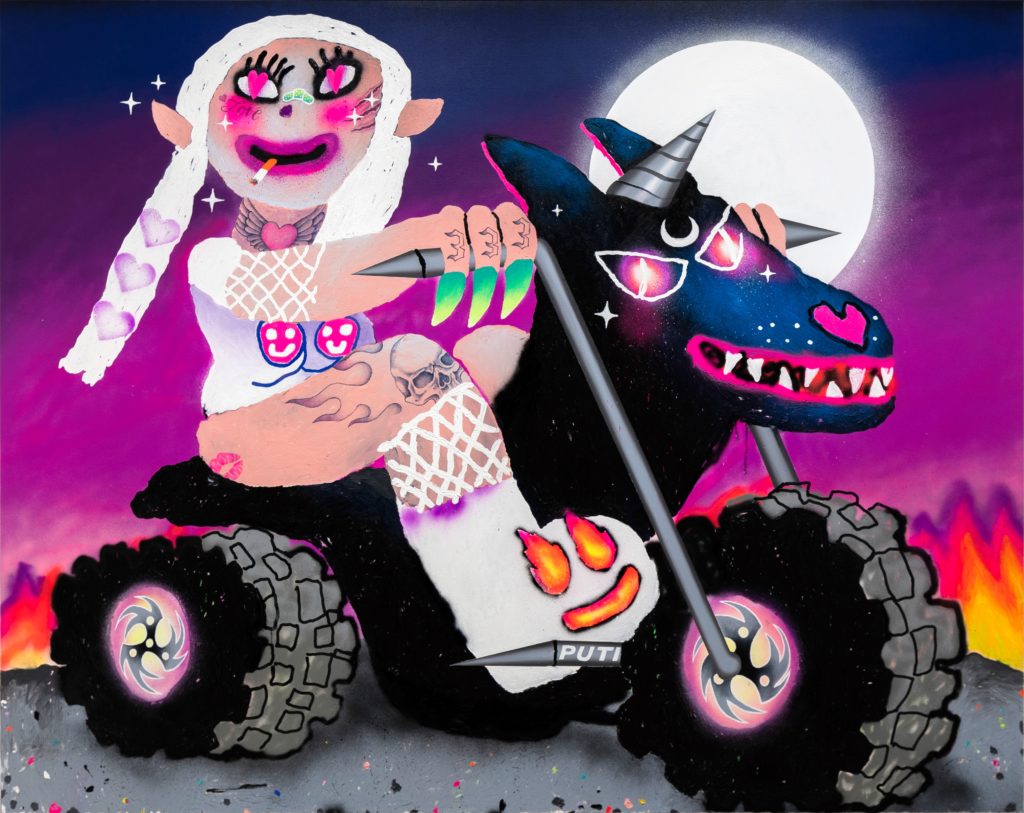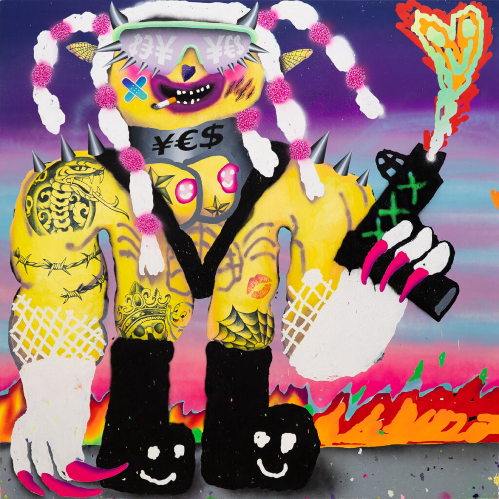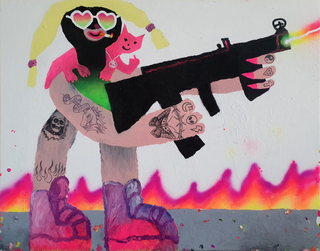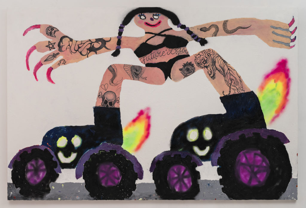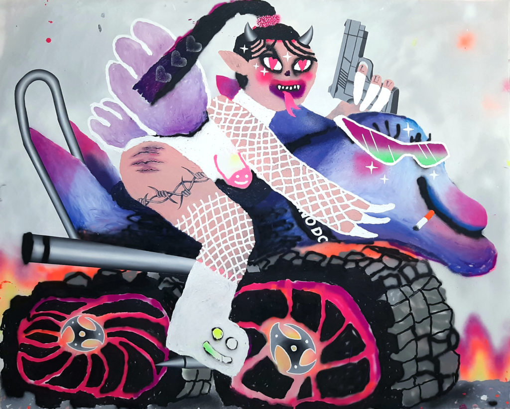 Oil, acrylic, charcoal, marker pen and spray on canvas