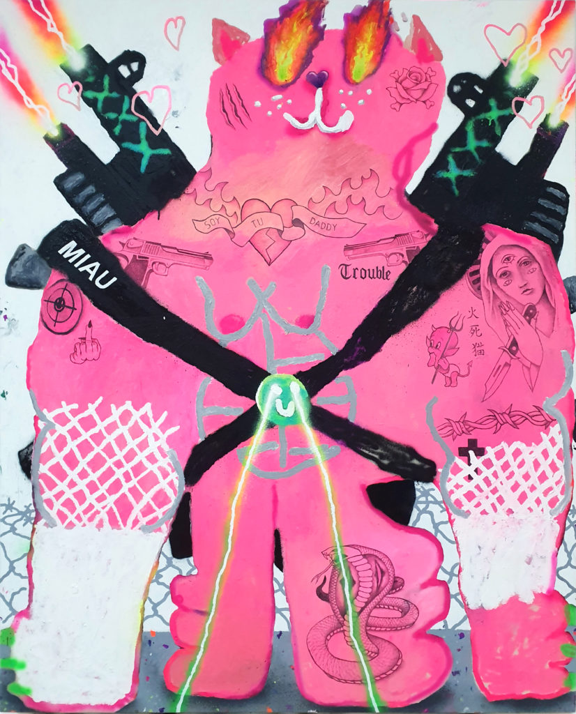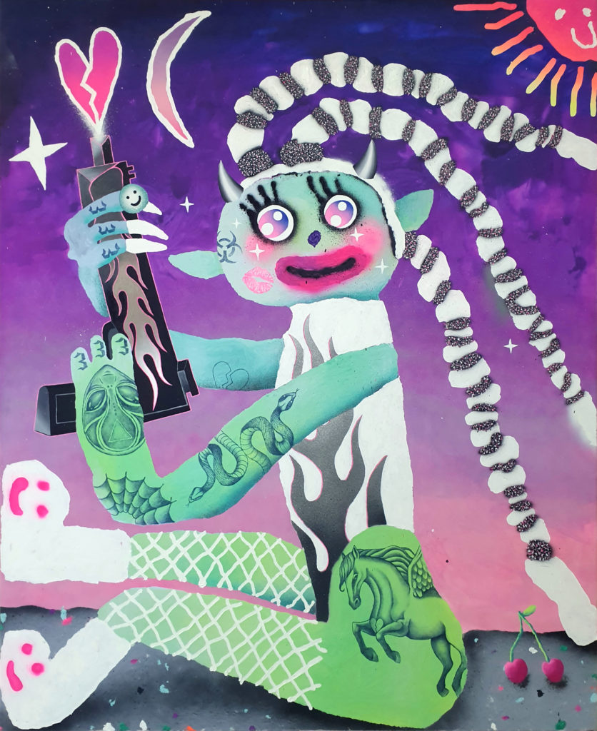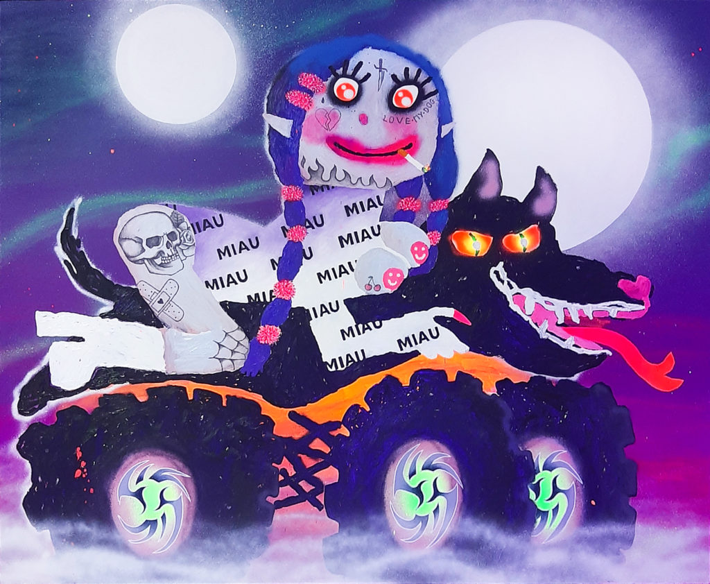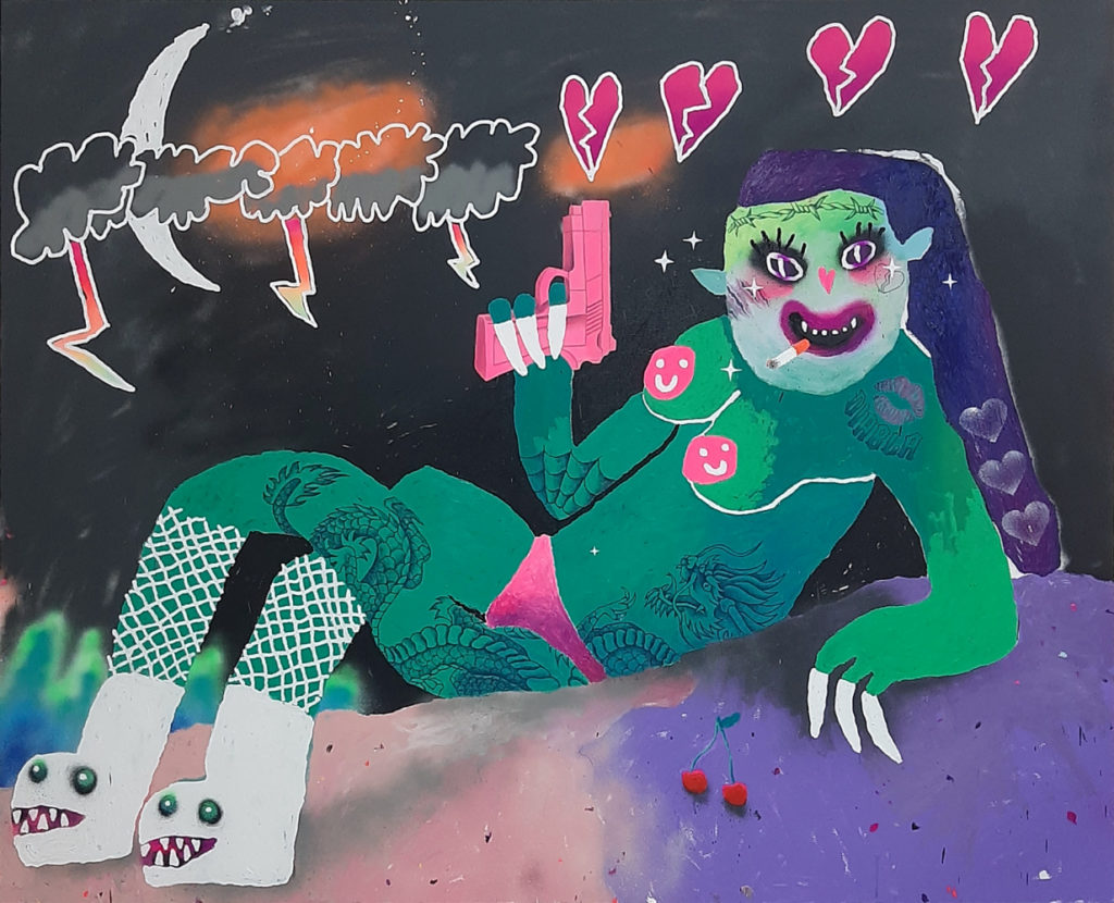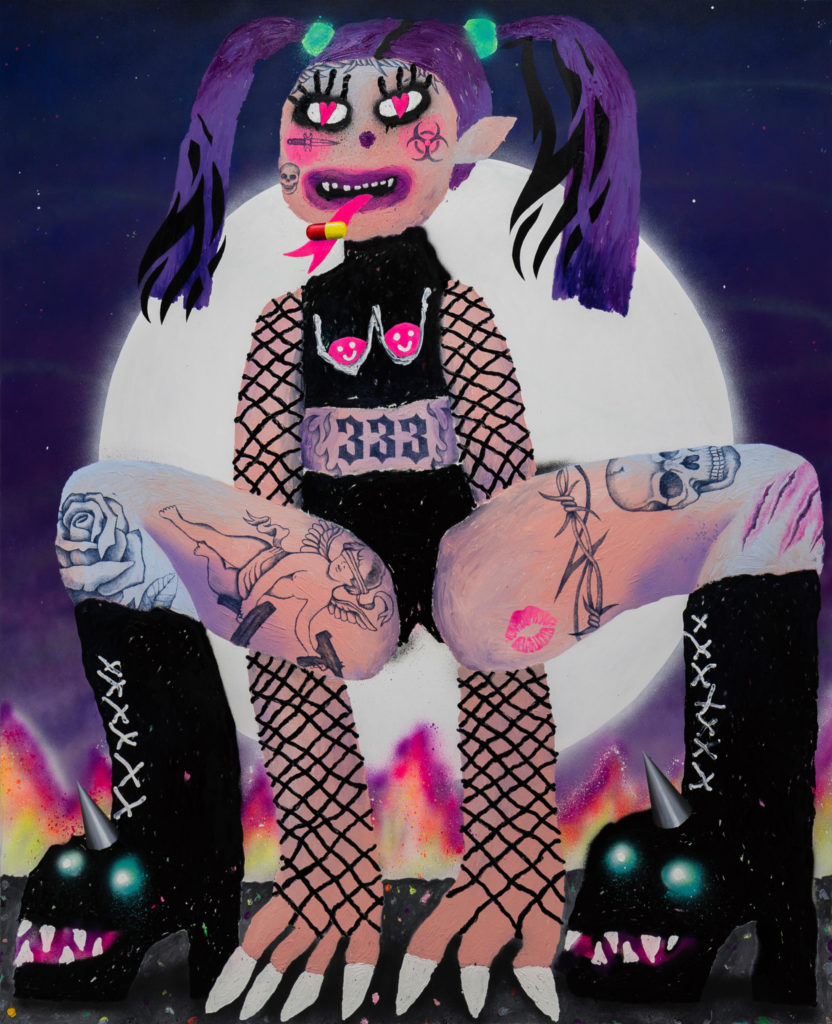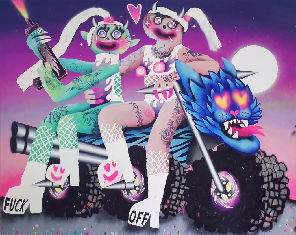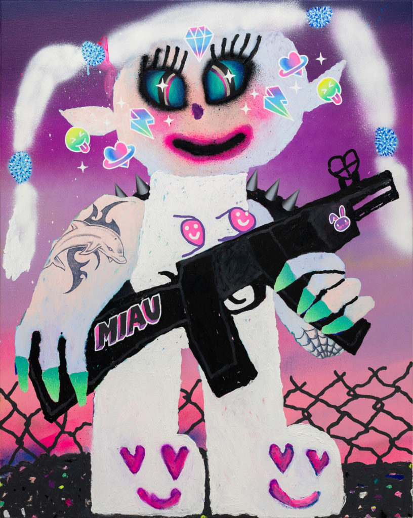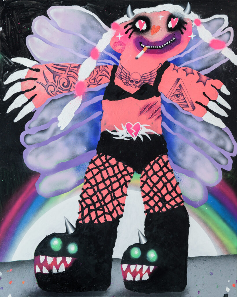 Oil, acrylic, charcoal, marker pen and spray on canvas