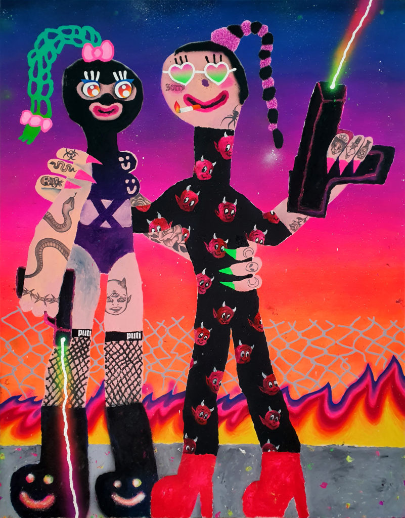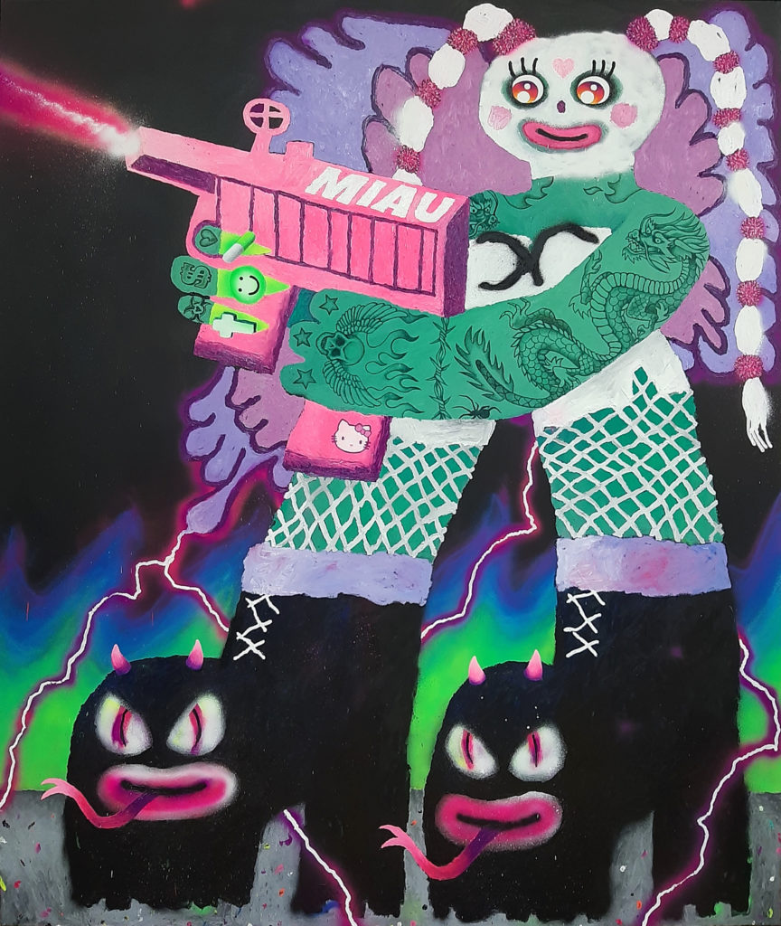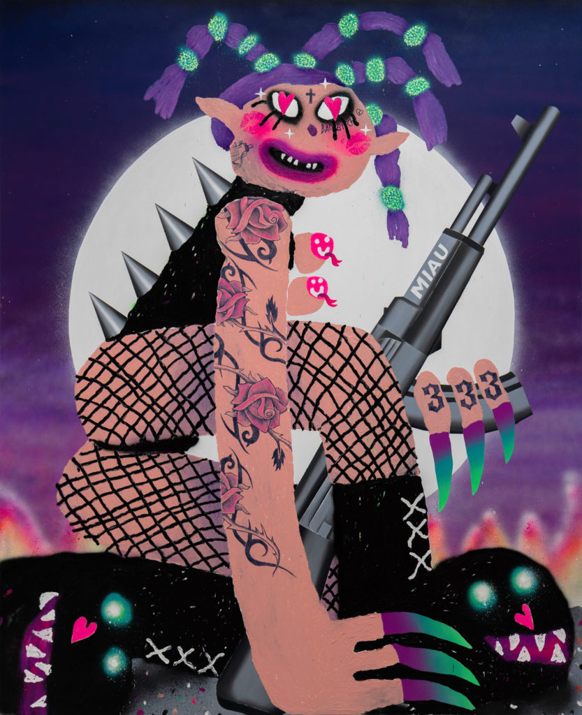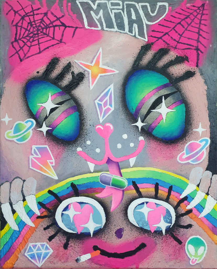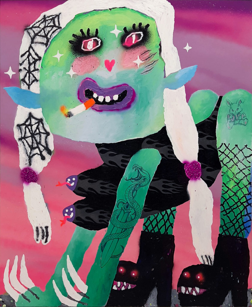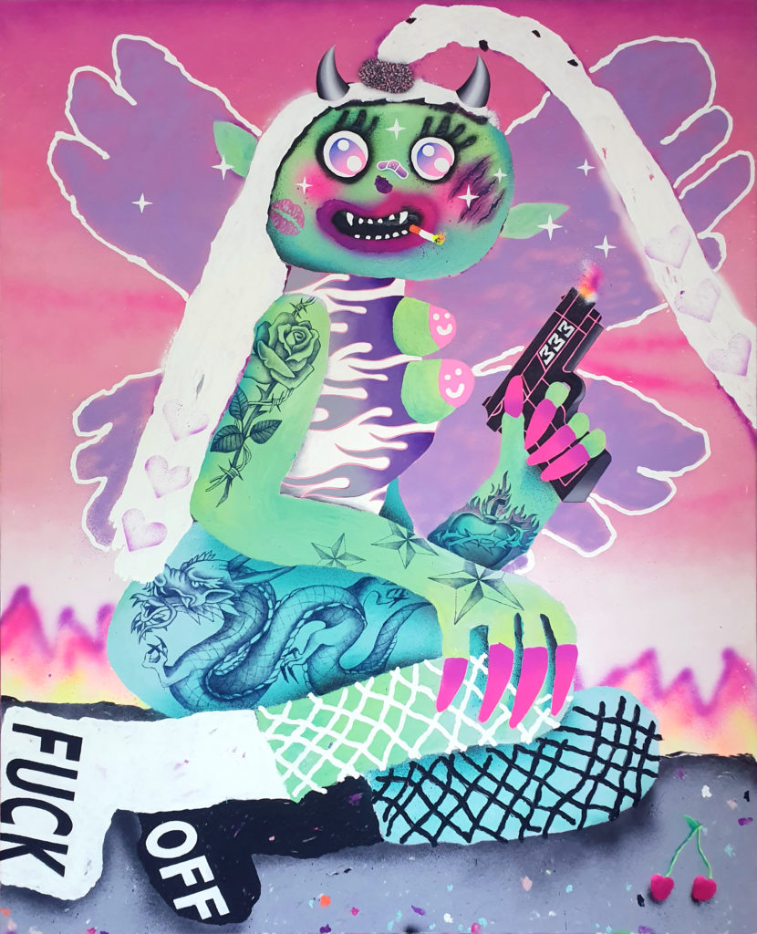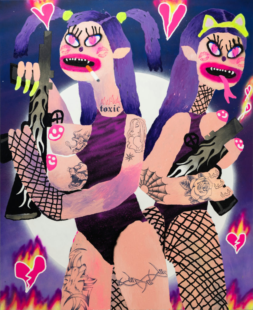 Oil, acrylic, charcoal, marker pen and spray on canvas
